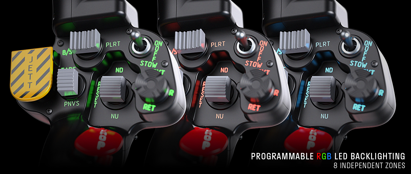 While not found on it's realworld counterpart - the VPC Dual-SF Collective Grip features a robust programmable backlighting system with 8 inpedendant zones. Backlighting can be configured based on button/shift states, or simply to match the aesthetic of your cockpit! For those seeking ultimate realism, the backlighting can be disabled.