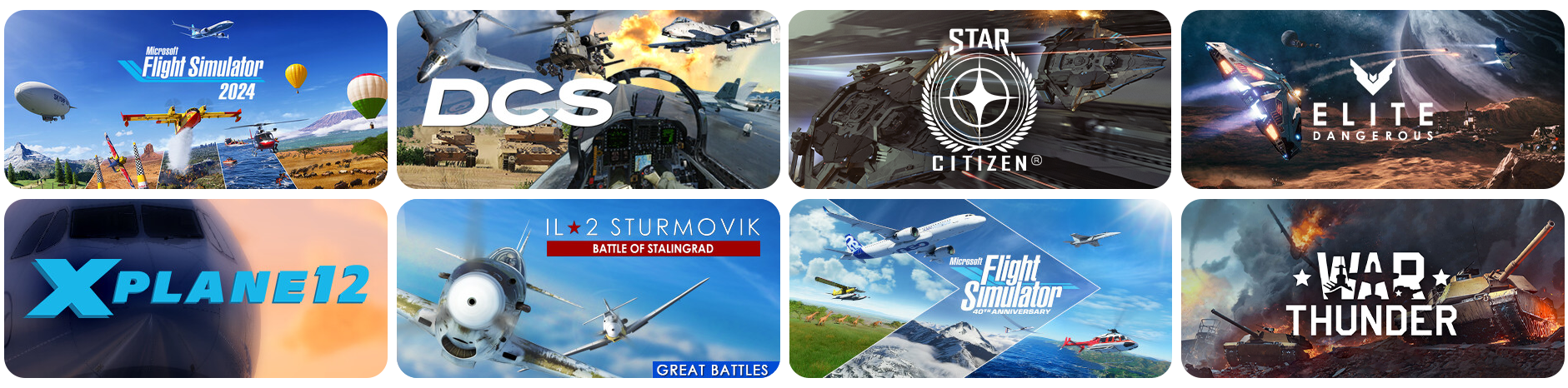VIRPIL Controls devices connect as standard USB input devices and are compatible with all simulators and games supporting controller inputs! Whether you're sightseeing in Microsoft Flight Simulator or exploring the galaxy in Elite Dangerous, VIRPIL will keep you in control!